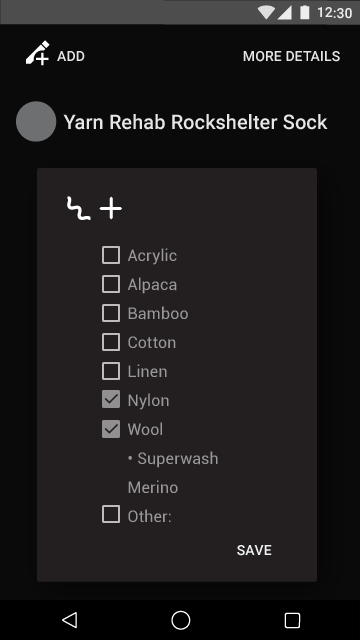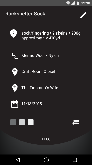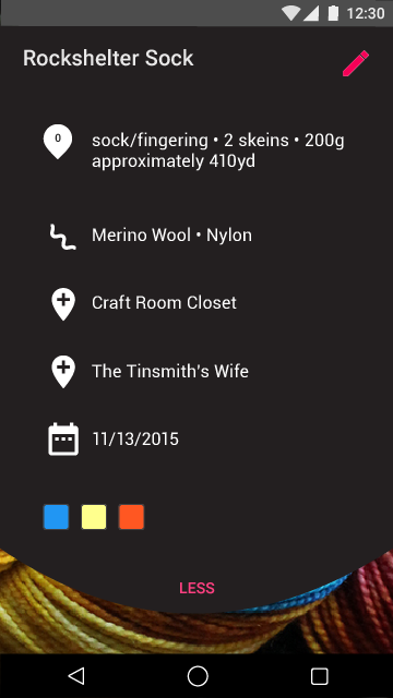 I imagine being able to select a color theme for icons and indicators. I also imagine that the app would pick up your photos to use as subtle backgrounds. To allow as many sorting options as possible, it pulls colors from uploaded photos so that the whole stash can be arranged that way in addition to material, amount, weight, location, etc.